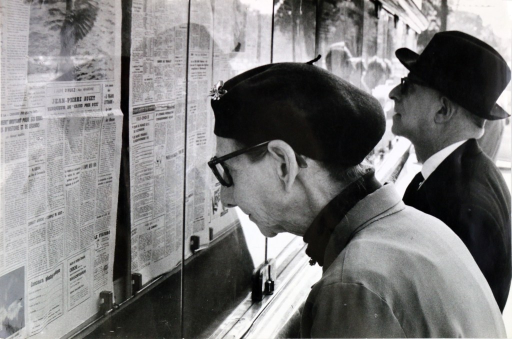 On Champs Elysées: No need to buy a daily paper, as all the pages were displayed behind glass outside of newspaper offices. Paris, 1960’s. Silver Gelatin Print (Resin), Size 6 ⅝ by 10”, signed. Published in Harold Chapman – Beats A Paris, page 87